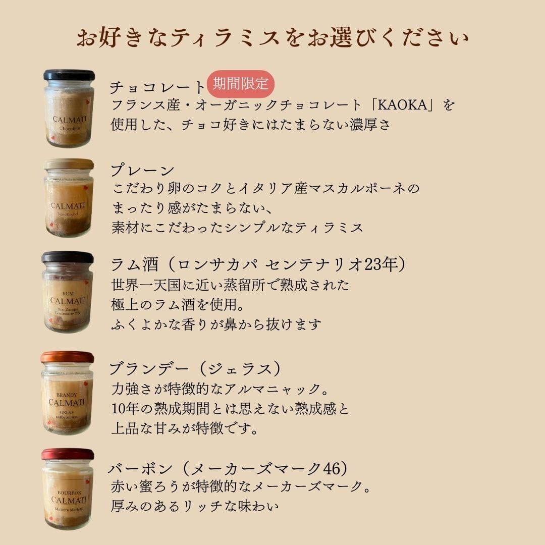 ※ラム・バーボン・ブランデーのティラミスにはお酒が含まれます。