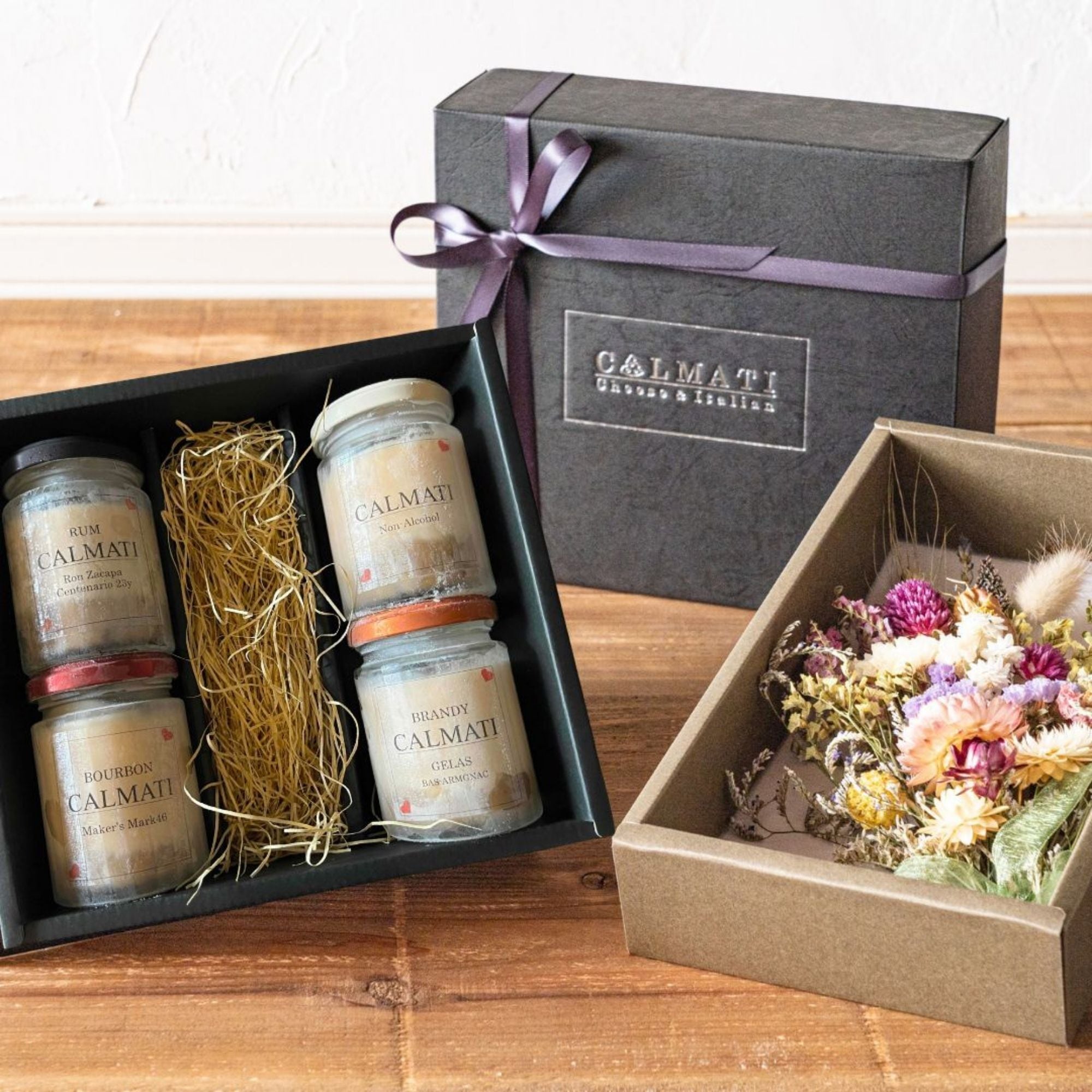 計4個入った食べ比べセットと箱入りドライフラワーと一緒にお送りいたします。