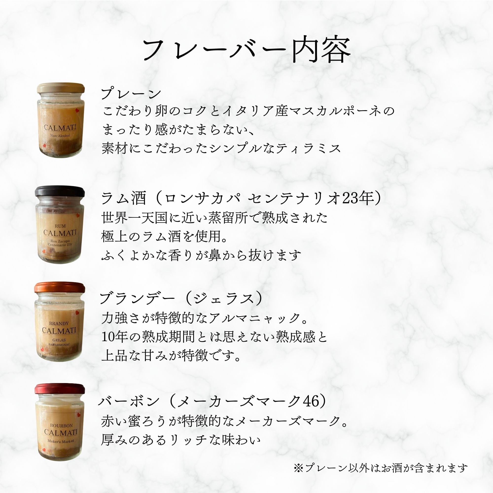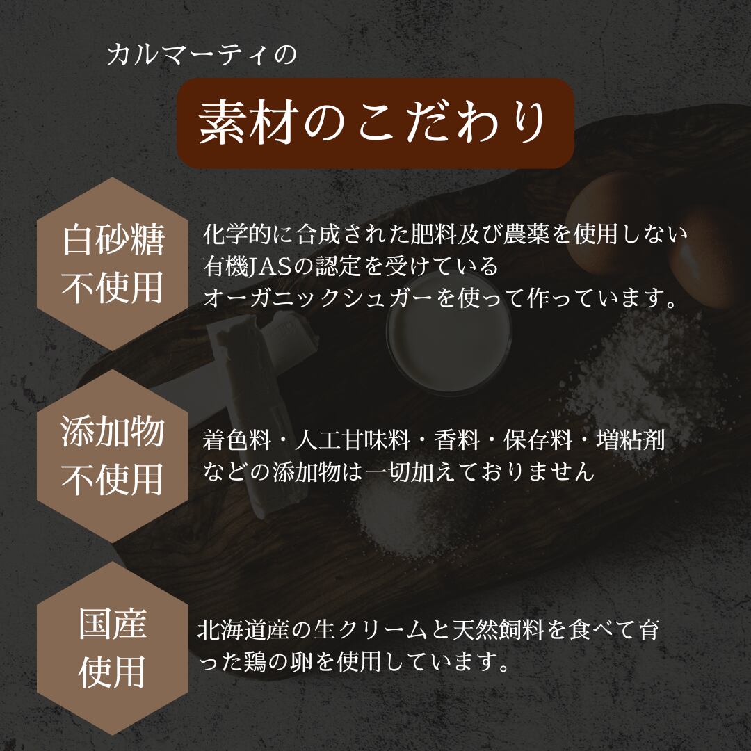 マスカルポーネ(イタリア)、生クリーム(北海道)、ラム酒・バーボン・ブランデー、オーガニックシュガー、卵、小麦粉、エスプレッソ